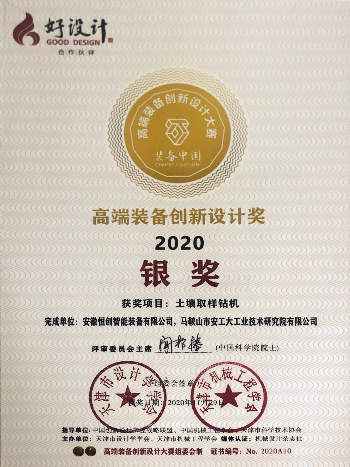 2020中國(guó)創(chuàng)新設(shè)計(jì)大會(huì)天津峰會(huì)@云峰會(huì)暨“好設(shè)計(jì)”合作伙伴“裝備中國(guó)”2020年高端裝備創(chuàng)新設(shè)計(jì)大賽頒獎(jiǎng)典禮及2020“華北地區(qū)好設(shè)計(jì)”獎(jiǎng)?lì)C獎(jiǎng)典禮于2020年11月29日在天津市河北區(qū)隆重召開(kāi)。安徽恒創(chuàng)智能裝備有限公司與馬鞍山市安工大工業(yè)技術(shù)研究院有限公司共同設(shè)計(jì)的土壤取樣鉆機(jī)榮獲本次高端裝備創(chuàng)新設(shè)計(jì)獎(jiǎng)銀獎(jiǎng)。